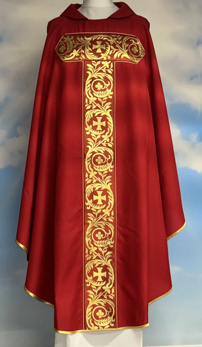 Ornat z pasem tkanym w kształcie krzyża TAU. Wykonany z lekkiego i przyjemnego w dotyku materiału.