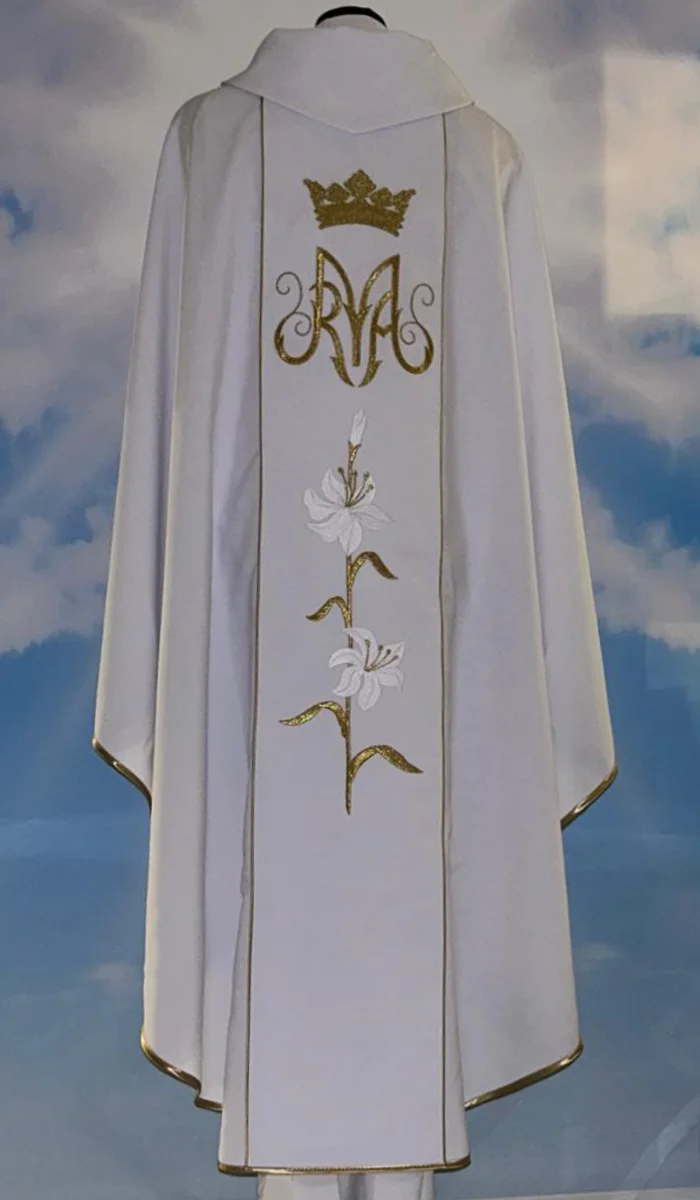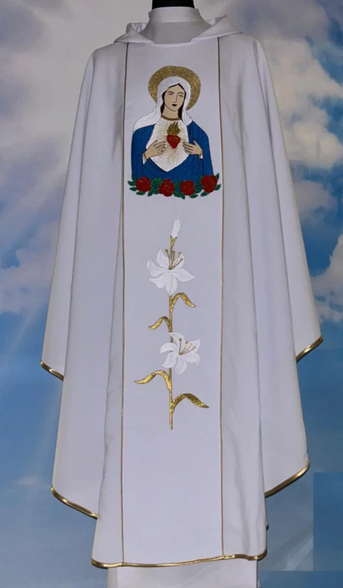 Ornat z pasami haftowanymi komputerowo. Wykonany z lekkiego i przyjemnego w dotyku materiału. Ornat z postacią Serca Maryi z lilią w ozdobniku.
