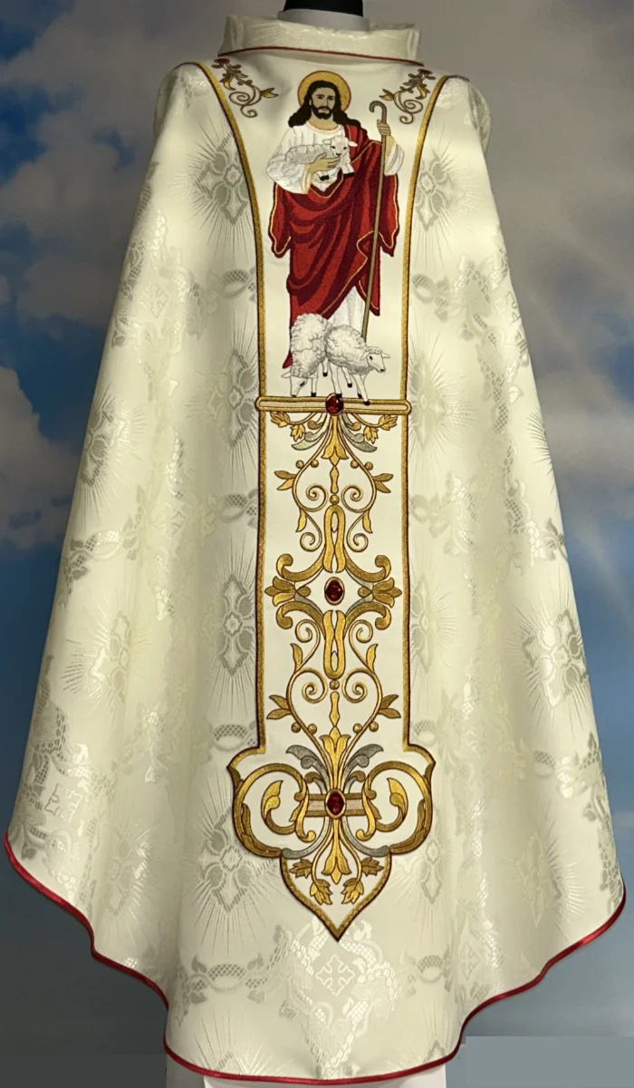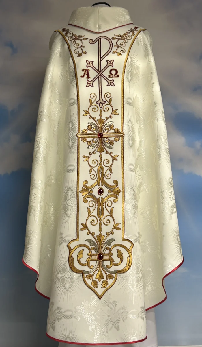 Ornat z pasami haftowanymi komputerowo. Wykonany z lekkiego i przyjemnego w dotyku materiału.